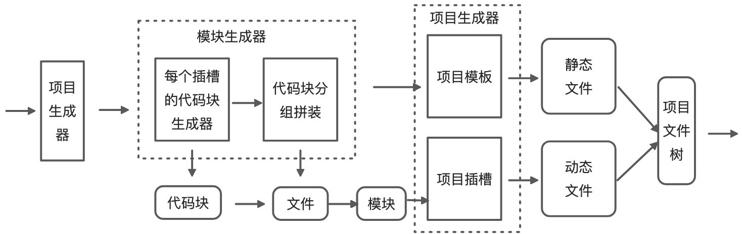 日常开发中,我们常常是基于某一个特定的项目框架,将一些配置、UI 代码、逻辑代码放到他们应该在的地方,最终形成一套可以 run 起来的业务系统。那么其实对于出码这件事,我们也可以层层拆解,项目 -> 插槽 -> 模块 -> 文件 -> 代码块(代码片段)。这样就能将复杂的项目产出问题,拆分为一个个相对专注且单一的代码块产出问题,同时也支持组合复用。